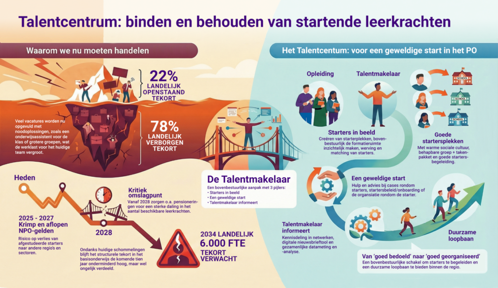 Het tekort aan leerkrachten in het primair onderwijs is al jaren een uitdaging. Hoewel het tekort tijdelijk iets is afgenomen door het wegvallen van NPO-gelden en krimp, is de verwachting dat het in de komende jaren opnieuw zal toenemen. Om het toekomstig tekort niet verder op te laten lopen, is het cruciaal om startende leerkrachten in hun eerste jaren goed te begeleiden én te behouden.
